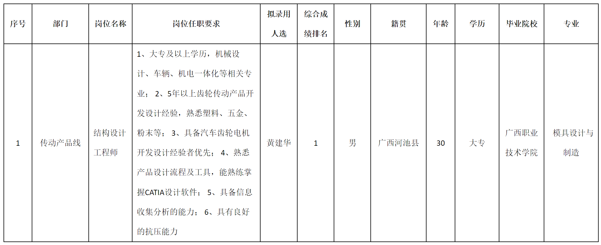 根據(jù)四川安和精密電子電器股份有限公司發(fā)布的招聘公告及招聘相關(guān)規(guī)定,經(jīng)筆試、面試、考察、體檢等程序,擬錄用黃建華同志到四川安和精密電子電器股份有限公司工作,現(xiàn)予以公示,具體情況如下: