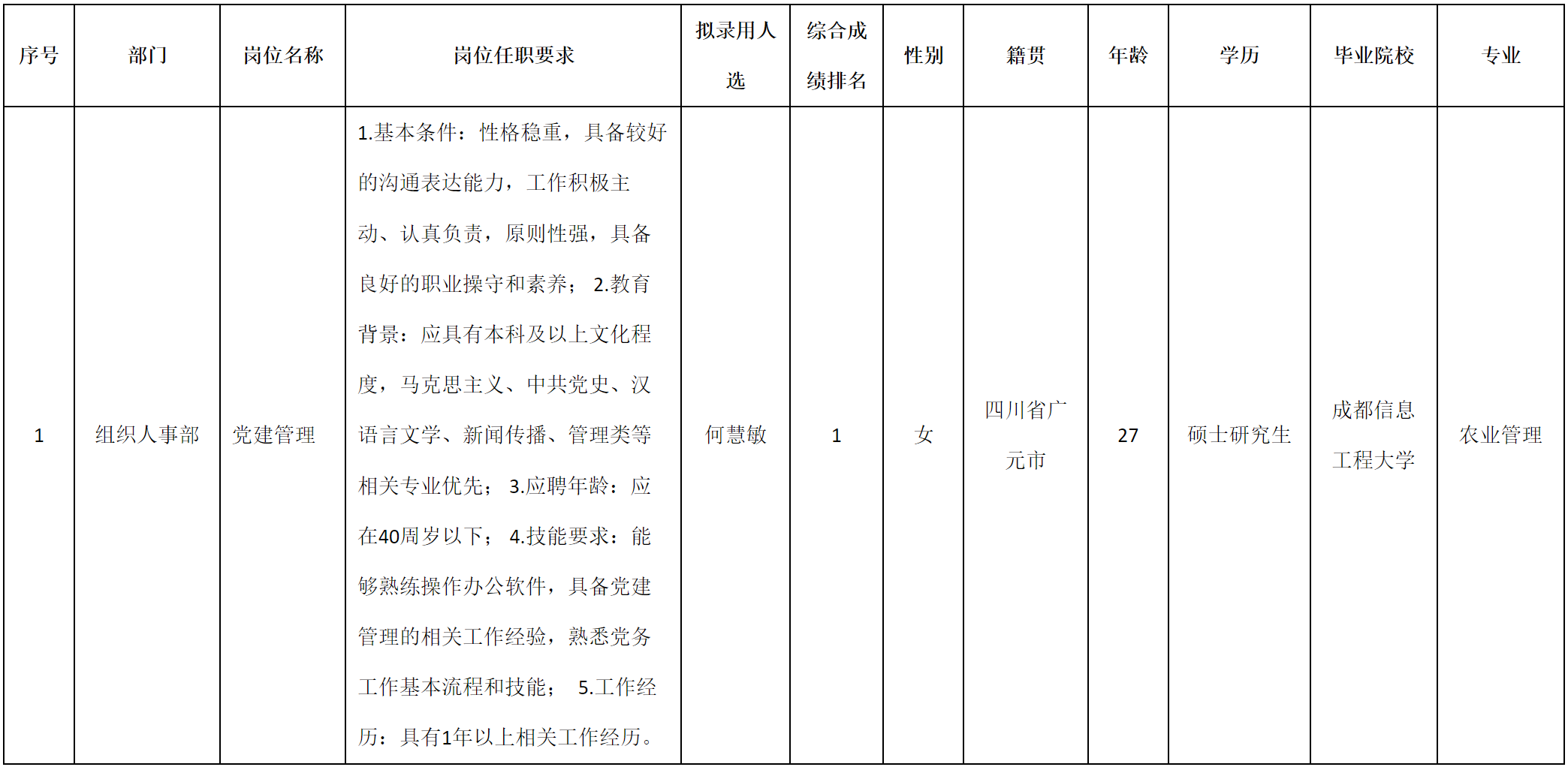 根據四川九州電子科技股份有限公司發(fā)布的招聘公告及招聘相關規(guī)定,經筆試、面試、考察、體檢等程序,擬錄用何慧敏同志到四川九州電子科技股份有限公司工作,現予以公示,具體情況如下: