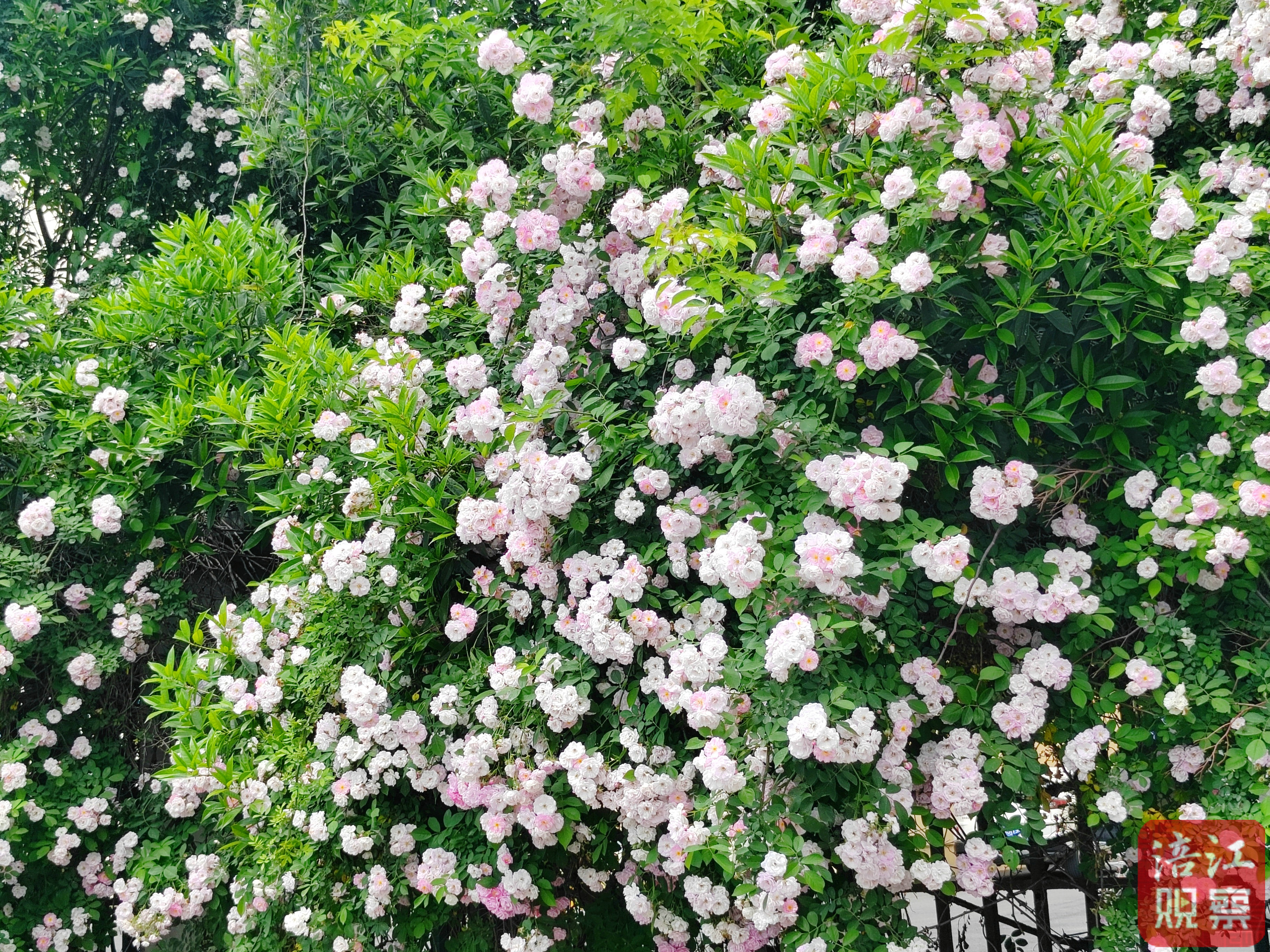 在江油市大康鎮(zhèn),主干道兩旁的薔薇藤蔓相互牽連,綴滿了雪白、粉紅的花朵,形成長(zhǎng)達(dá)數(shù)百米的繽紛“花廊”,引得游客紛紛駐足欣賞、打卡拍照。
