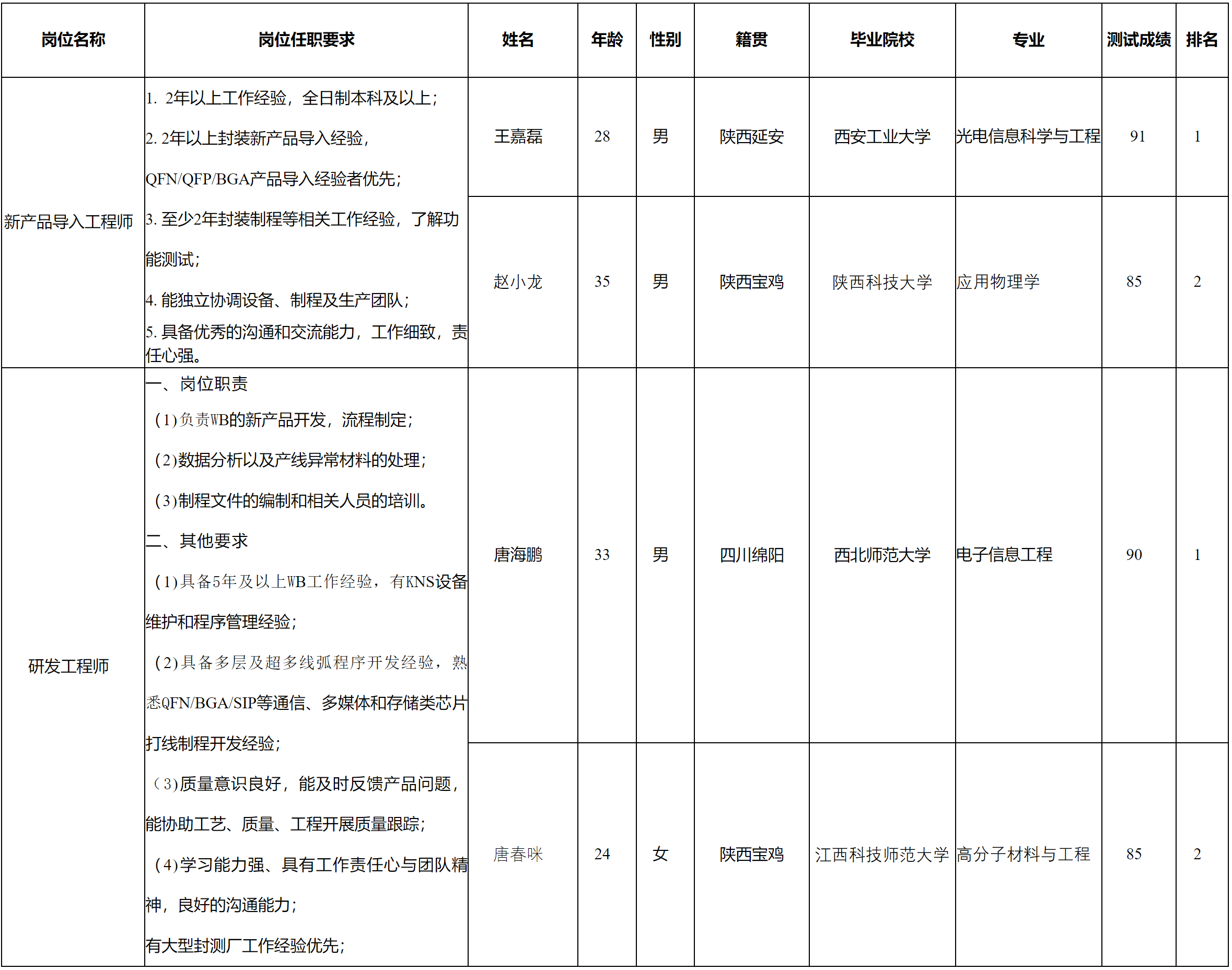 根據(jù)四川啟賽微電子有限公司發(fā)布的招聘公告及招聘相關(guān)規(guī)定,經(jīng)用人單位面試程序,現(xiàn)將測試合格人員予以公示。