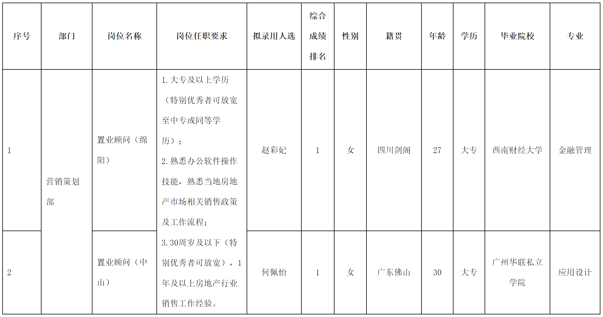 根據(jù)四川長虹置業(yè)有限公司發(fā)布的招聘公告及招聘相關規(guī)定,經(jīng)筆試、面試、考察、體檢等程序,擬錄用趙彩妃同志、何佩怡同志到四川長虹置業(yè)有限公司工作,現(xiàn)予以公示,具體情況如下: