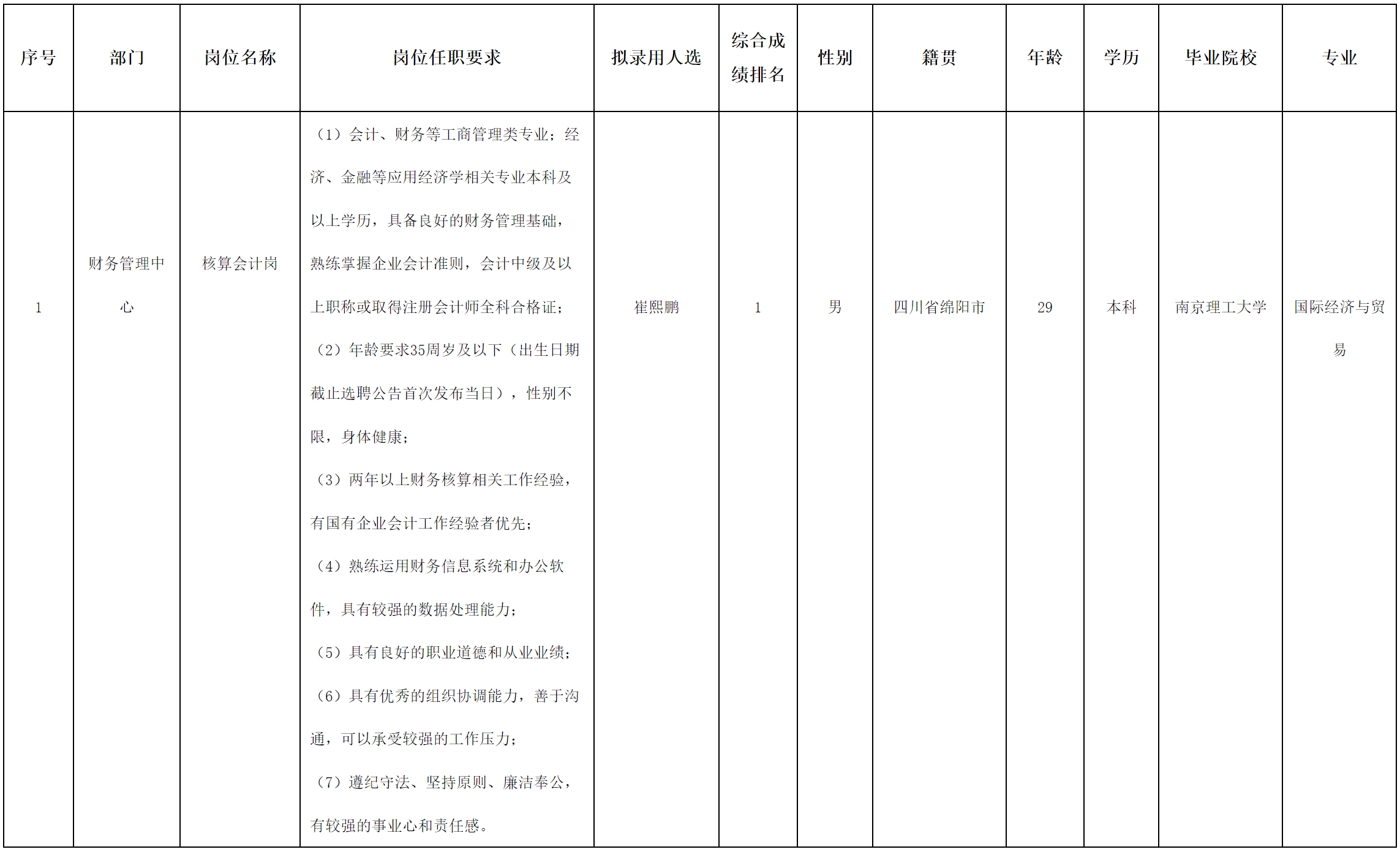 根據(jù)綿陽市投資控股(集團)有限公司發(fā)布的招聘公告及招聘相關(guān)規(guī)定,經(jīng)筆試、面試、考察、體檢等程序,擬錄用崔熙鵬同志到綿陽市投資控股(集團)有限公司工作,現(xiàn)予以公示,具體情況如下: