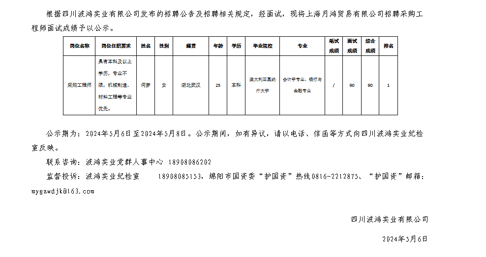 四川波鴻實(shí)業(yè)有限公司關(guān)于招聘上海月鴻貿(mào)易有限公司招聘采購工程師測試成績的公示