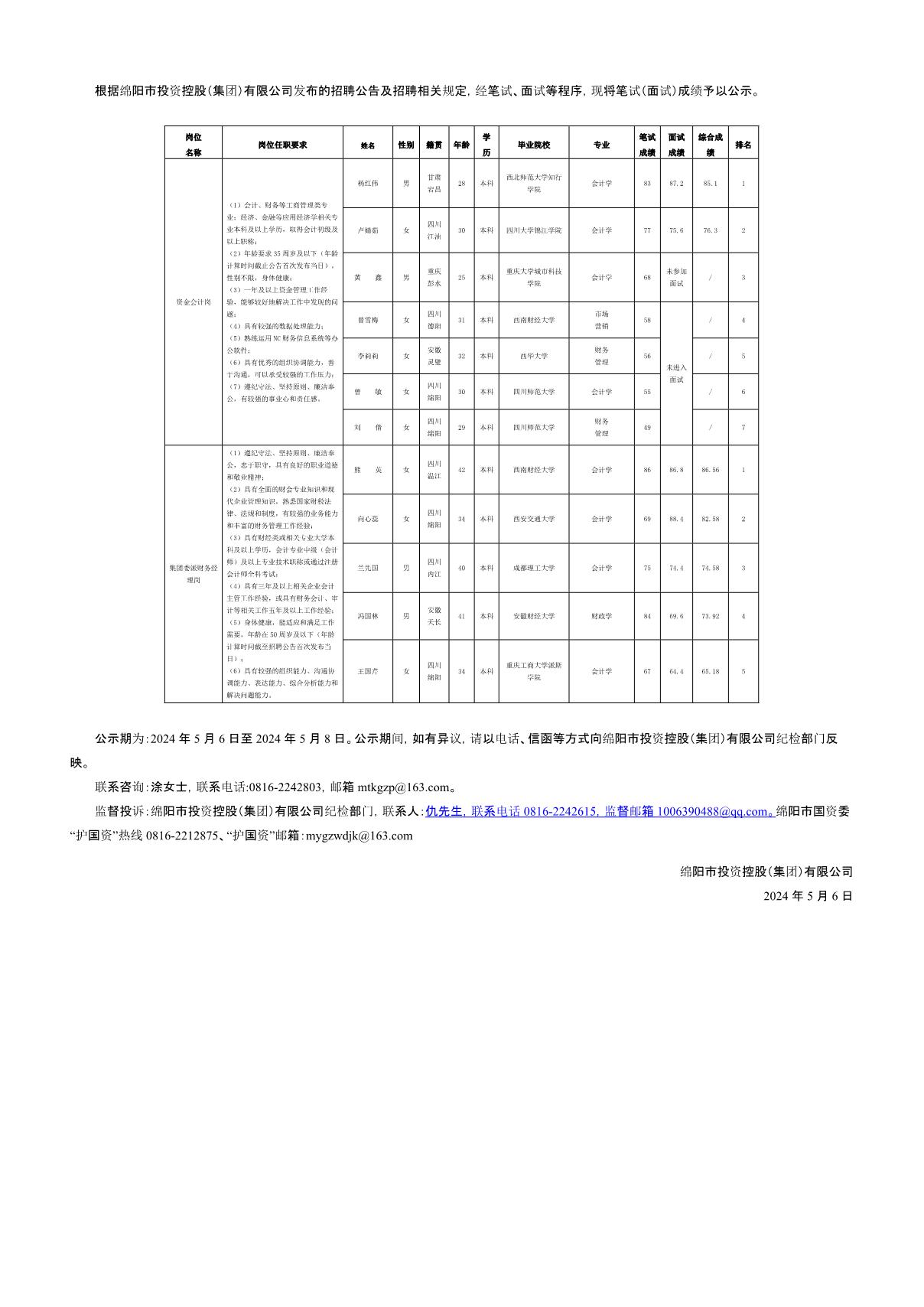 綿陽(yáng)市投資控股(集團(tuán))有限公司關(guān)于招聘資金會(huì)計(jì)等崗位測(cè)試成績(jī)的公示