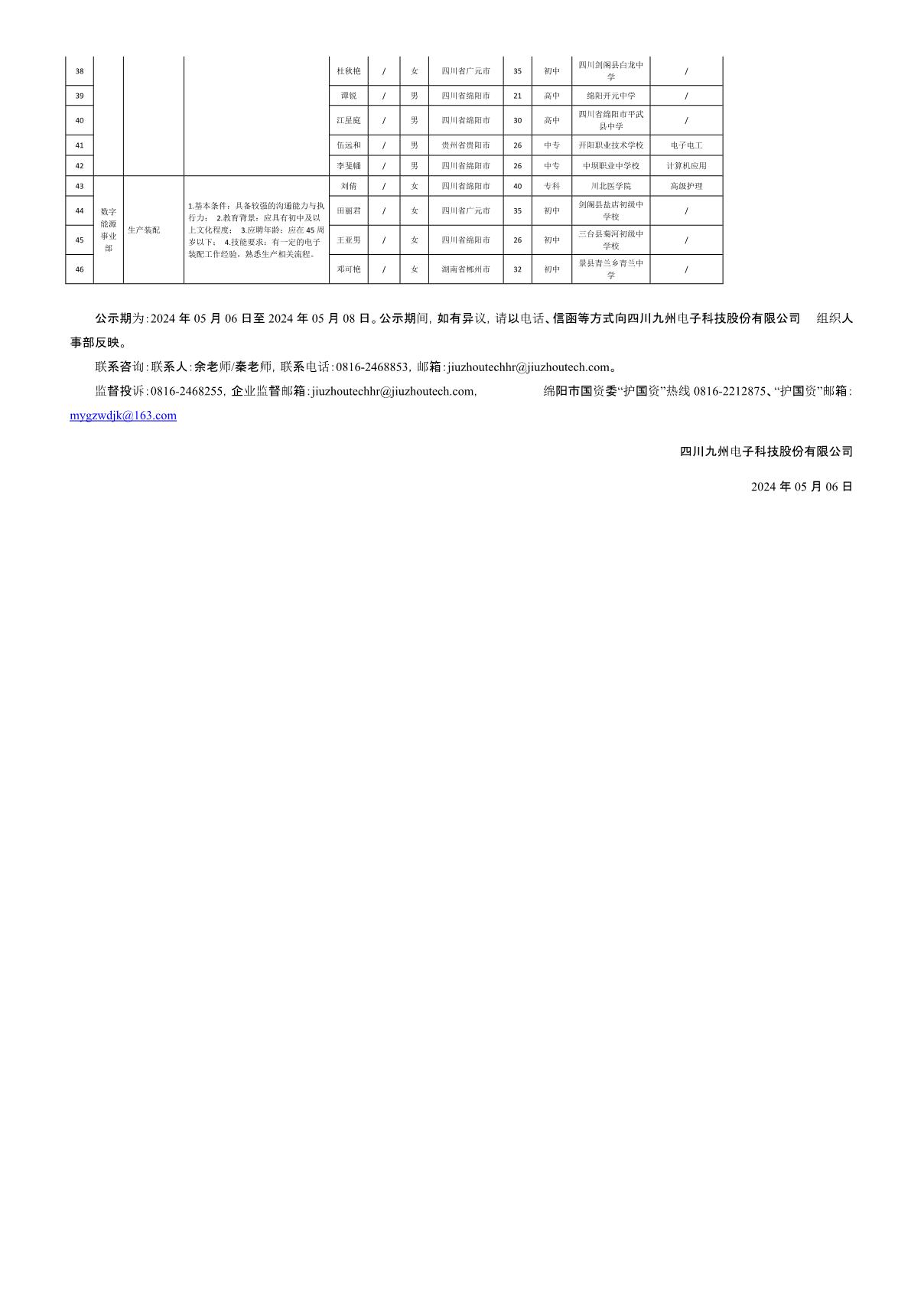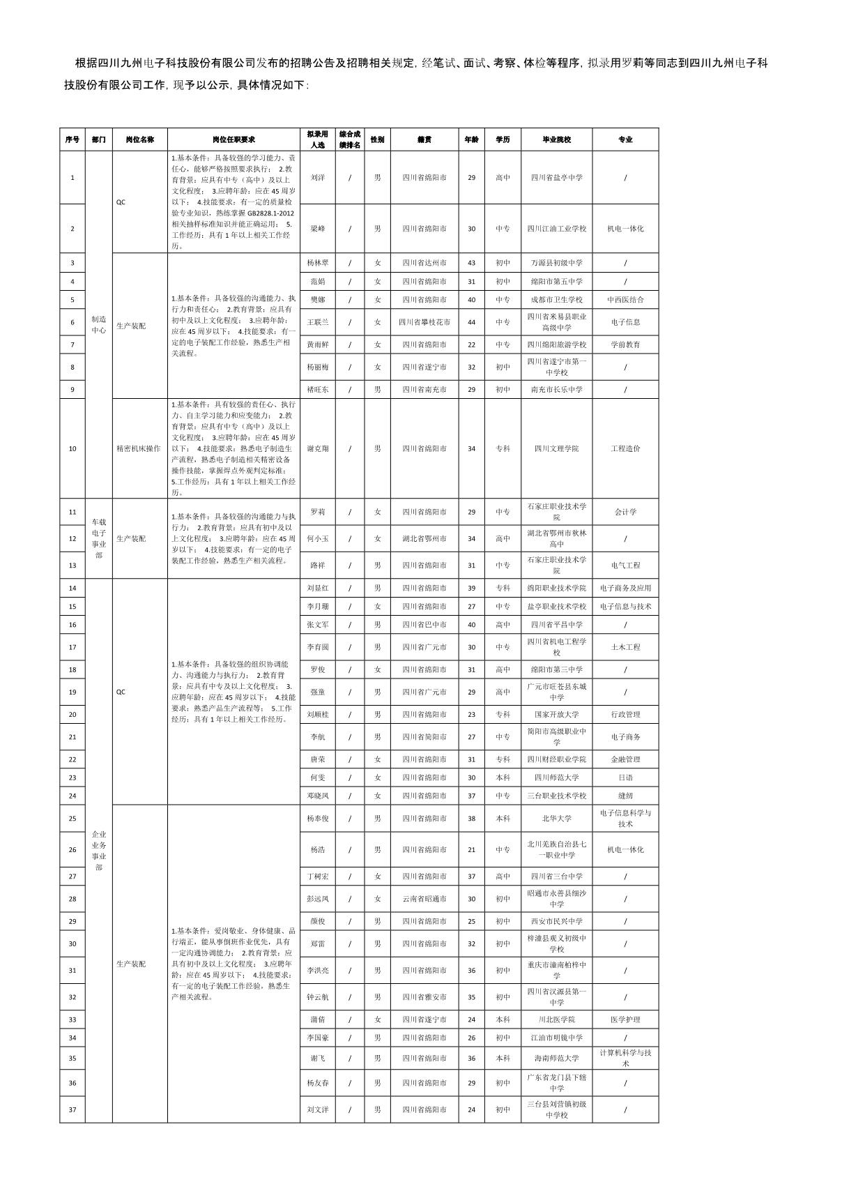四川九州電子科技股份有限公司關(guān)于招聘生產(chǎn)裝配等崗位擬錄用人員的公示