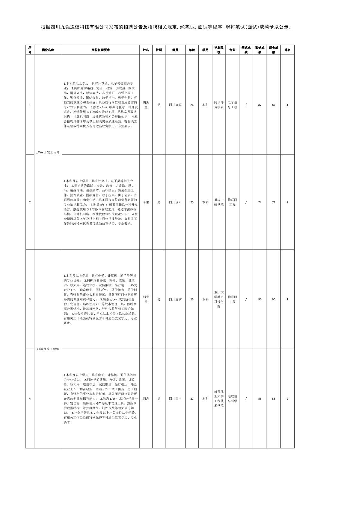 四川九強(qiáng)通信科技有限公司關(guān)于招聘前端開(kāi)發(fā)工程師等崗位測(cè)試成績(jī)的公示