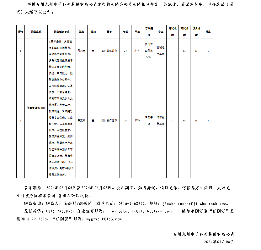 四川九州電子科技股份有限公司關(guān)于招聘DQA崗位測(cè)試成績(jī)的公示