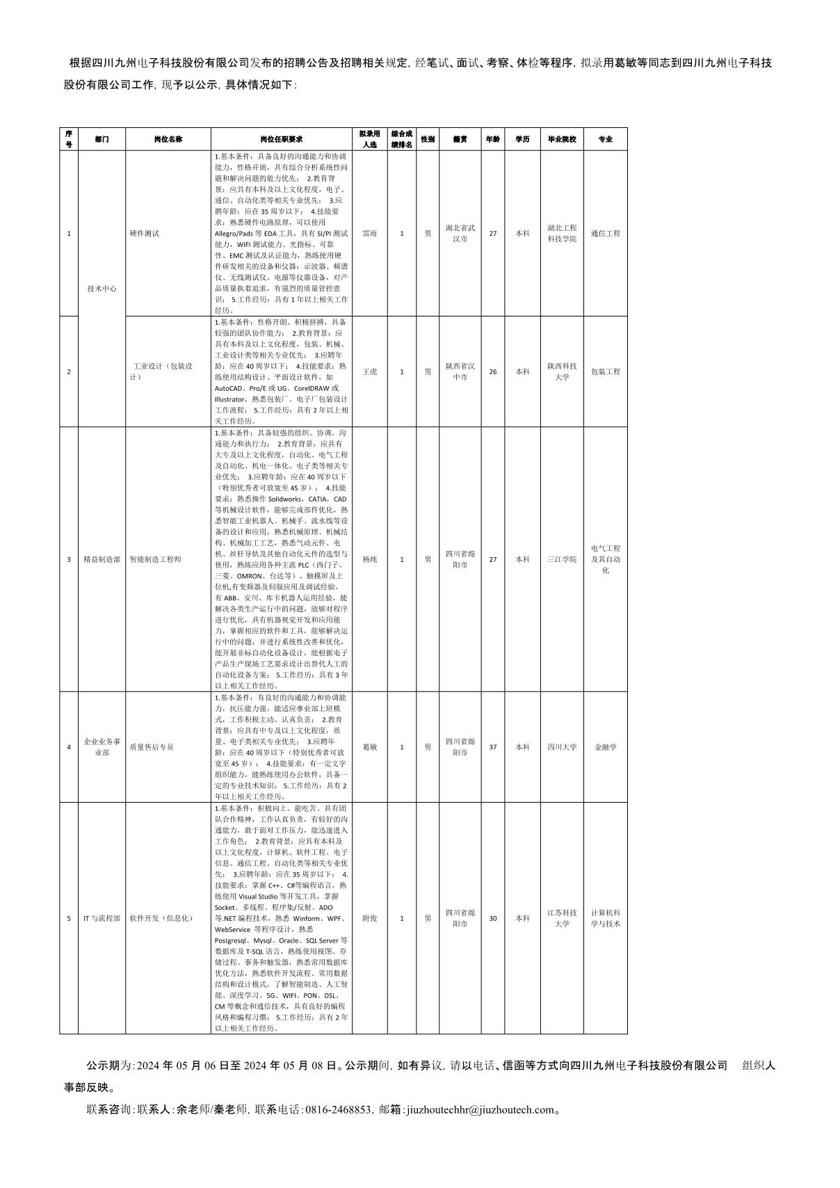 四川九州電子科技股份有限公司關(guān)于招聘質(zhì)量售后專(zhuān)員等崗位擬錄用人員的公示