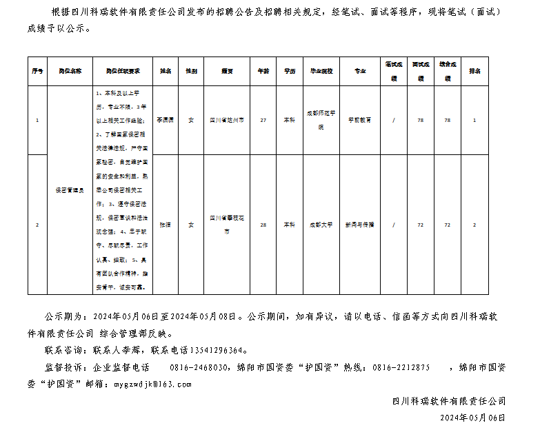 四川科瑞軟件有限責(zé)任公司關(guān)于招聘保密管理員測(cè)試成績(jī)的公示