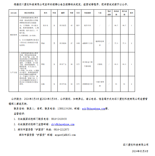 四川愛(ài)創(chuàng)科技有限公司關(guān)于招聘物控管理等崗位測(cè)試成績(jī)的公示