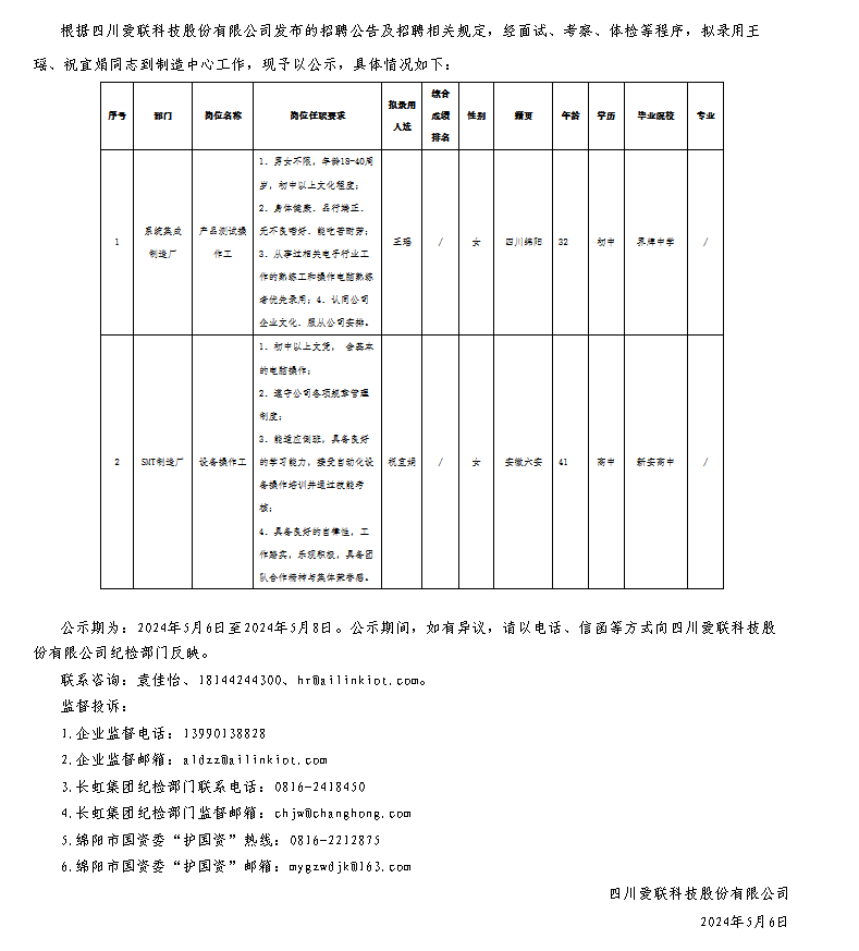 四川愛聯(lián)科技股份有限公司關(guān)于招聘操作職崗位擬錄用人員的公示