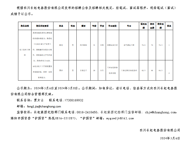 四川長虹電器股份有限公司關于招聘化工技術工程師崗位測試成績的公示