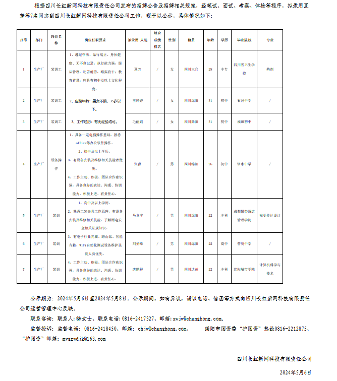 四川長虹新網(wǎng)科技有限責(zé)任公司關(guān)于招聘操作職員工擬錄用人員的公示