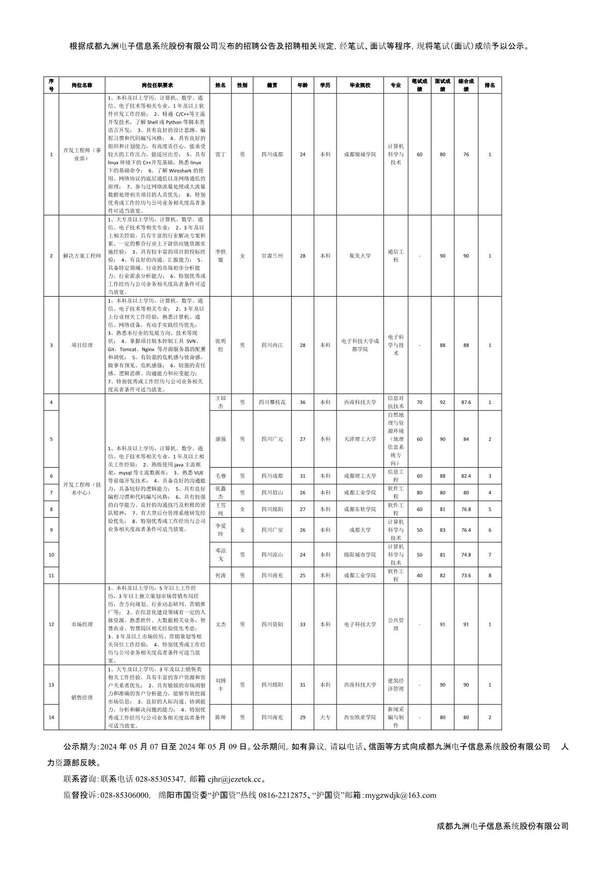 成都九洲電子信息系統(tǒng)股份有限公司關(guān)于招聘項目經(jīng)理等崗位測試成績的公示