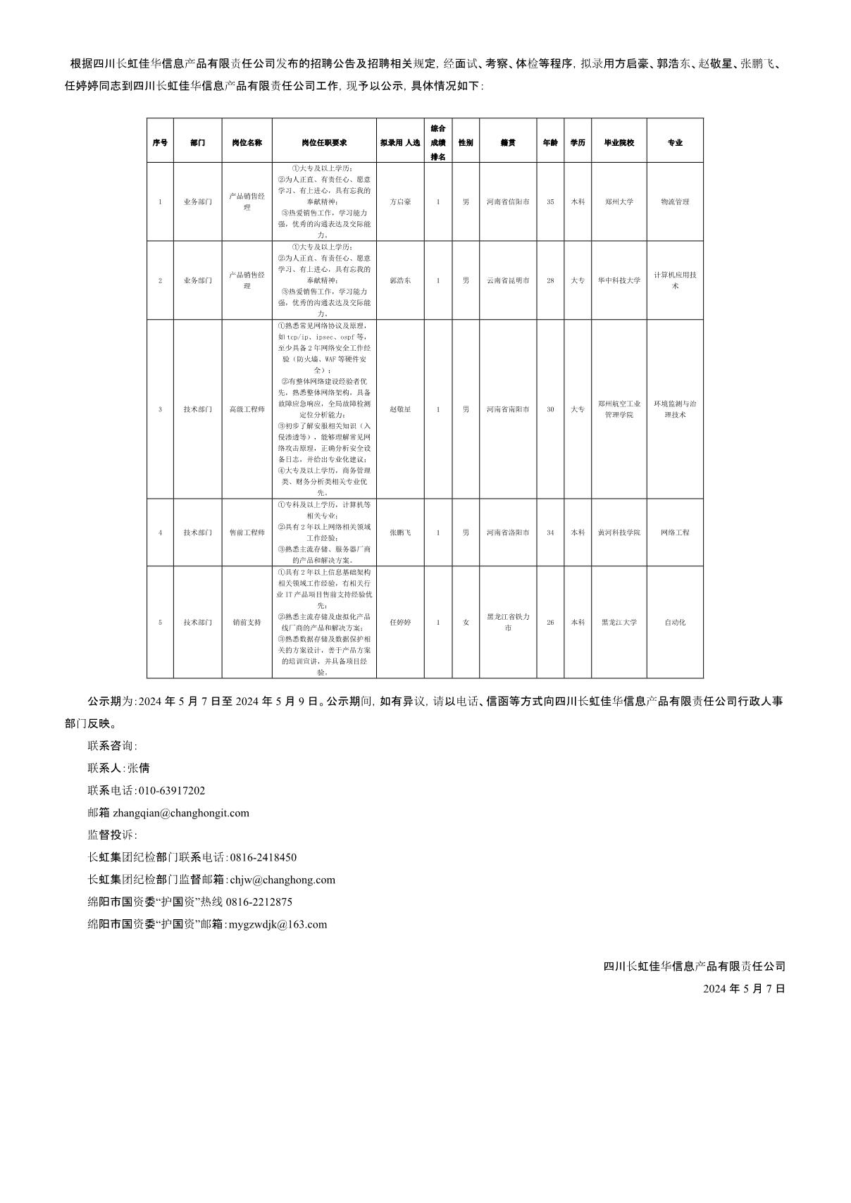 四川長虹佳華信息產(chǎn)品有限責任公司關于招聘高級工程師等崗位擬錄用人員的公示