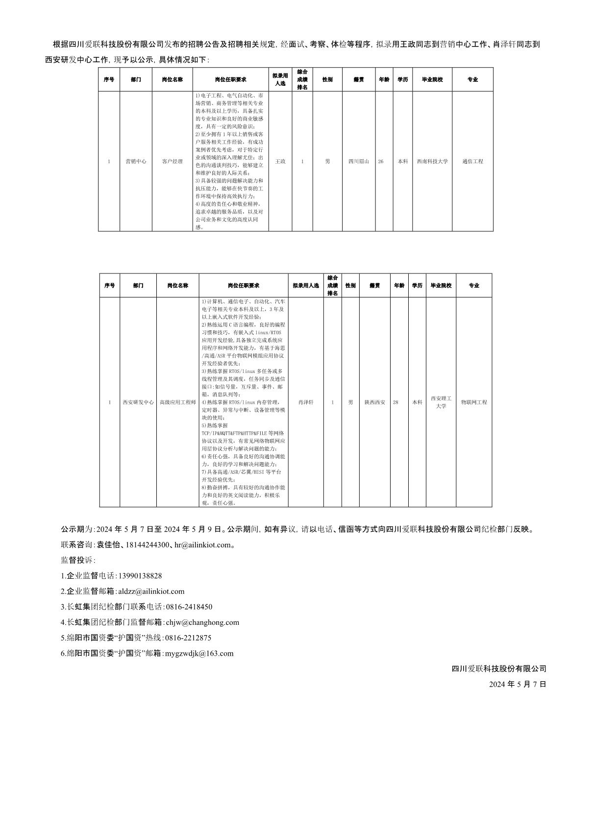 四川愛聯(lián)科技股份有限公司關于招聘客戶經理等崗位擬錄用人員的公示