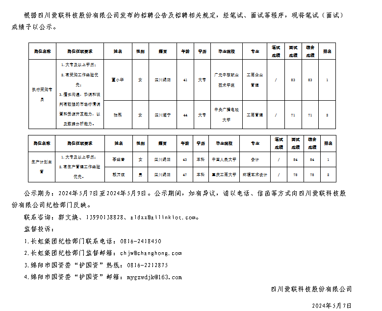 四川愛聯(lián)科技股份有限公司關于招聘執(zhí)行采購專員等崗位測試成績的公示