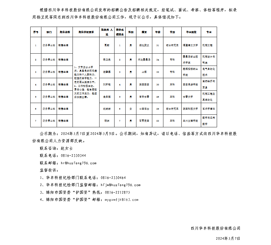 四川華豐科技股份有限公司關(guān)于招聘銷售經(jīng)理崗位擬錄用人員的公示