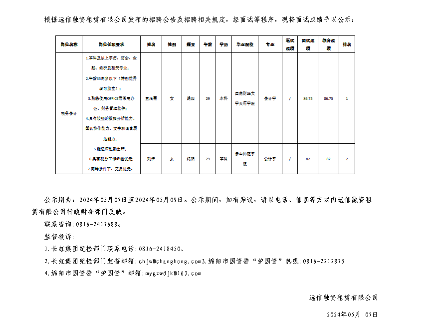 遠(yuǎn)信融資租賃有限公司關(guān)于招聘稅務(wù)會計測試成績的公示
