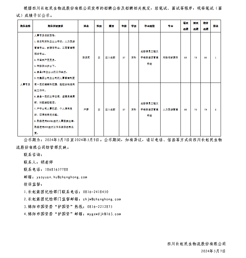 四川長(zhǎng)虹民生物流股份有限公司關(guān)于招聘人事專員測(cè)試成績(jī)的公示