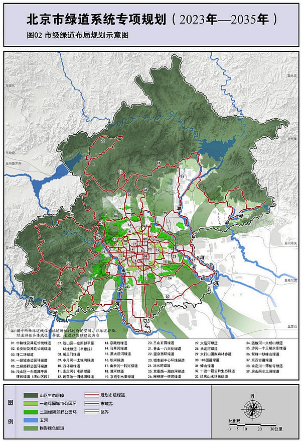 北京市級(jí)綠道布局規(guī)劃示意圖。(圖片來自《北京市綠道系統(tǒng)專項(xiàng)規(guī)劃(2023年—2035年)》)。