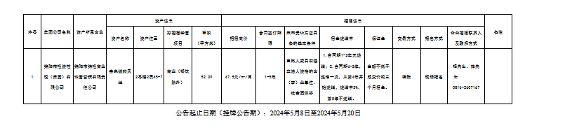 綿陽市綿投商業(yè)運(yùn)營管理有限責(zé)任公司資產(chǎn)出租公告