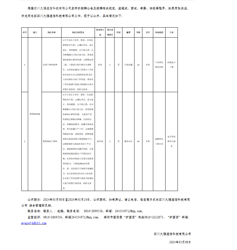 四川九強(qiáng)通信科技有限公司關(guān)于招聘射頻調(diào)試工程師等崗位擬錄用人員的公示