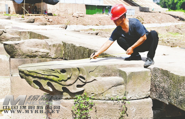 “在龍的兩腮、后腦、后頸四個地方,都用了蝴蝶榫卯進(jìn)行扣接。”陳曉順指著保存較好的第三條龍龍頭向記者介紹,和木匠榫卯工藝不同,石雕榫卯更大、更粗獷,并且修復(fù)八條龍龍頭、龍尾和雕刻所用的石材,都是從郪江河床里打撈的石頭,這些從橋面掉落的板石,歷經(jīng)河水的沖刷,經(jīng)過雕刻技藝的古法處理,以修舊如舊的方式再現(xiàn)龍頭龍尾原生態(tài)的輪廓,將還原其歷經(jīng)風(fēng)雨滄桑的形態(tài)和神韻。