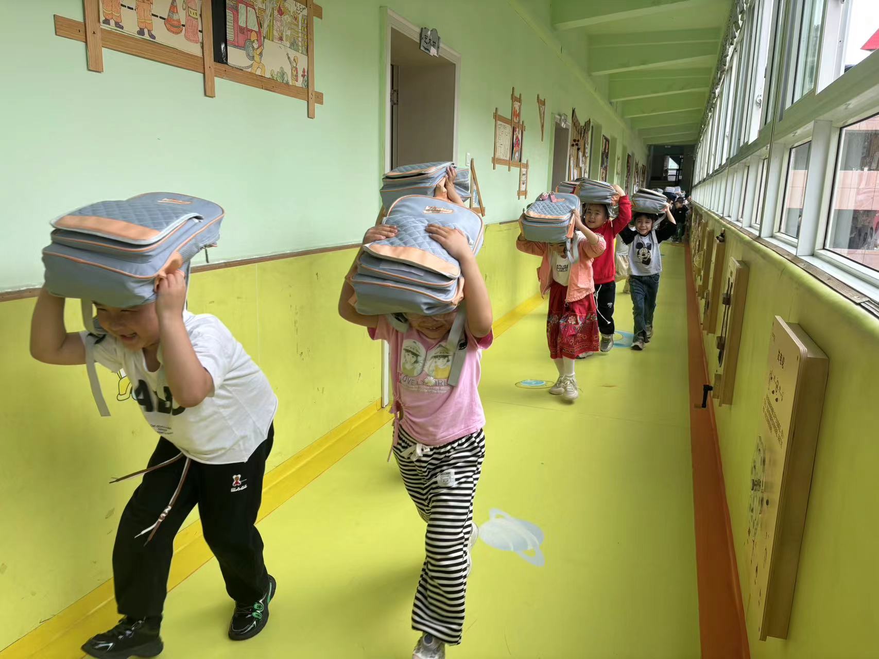 其次,開展“安全疏散——演練”活動。當(dāng)日上午10:00分左右,第一次警報響起,師幼立刻停止一切活動,教師迅速組織幼兒躲避,一樓幼兒有序撤離到安全地帶;第二次警報拉響,剩余幼兒按照預(yù)定的疏散路線向著安全地帶撤離。該園相關(guān)負(fù)責(zé)人及各通道負(fù)責(zé)人員第一時間到達(dá)指定位置,協(xié)助指揮保護(hù)孩子們向安全地帶撤離。整個疏散過程用時2分19秒,所有人員安全到達(dá)指定疏散地點(diǎn)。