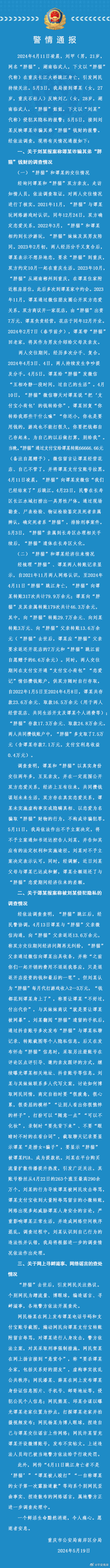 5月19日,重慶警方發(fā)布關(guān)于劉某(男,21歲,網(wǎng)名“胖貓”)在重慶長(zhǎng)江大橋跳江身亡事件相關(guān)情況的通報(bào)。內(nèi)容如下: