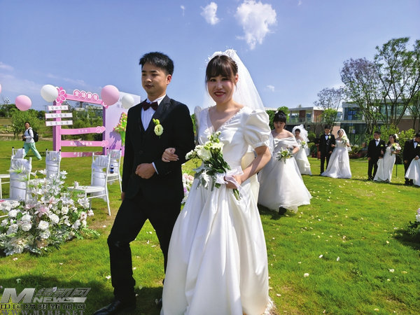 陽光、草坪、鮮花、氣球、愛心打卡點……當(dāng)天上午,安州區(qū)南湖公園成了一片粉紅色的甜蜜海洋。10對新人身著精心挑選的禮服,合著幸福的節(jié)拍,帶著甜蜜和溫馨攜手入場。在現(xiàn)場嘉賓和親友們的見證下,婚禮誓言、交換戒指、擁吻禮等環(huán)節(jié)一一進(jìn)行,婚禮儀式圓滿禮成。主辦方還特別安排了集體頒證環(huán)節(jié),工作人員為新人們頒發(fā)結(jié)婚證書,共同祝福新人喜結(jié)良緣。