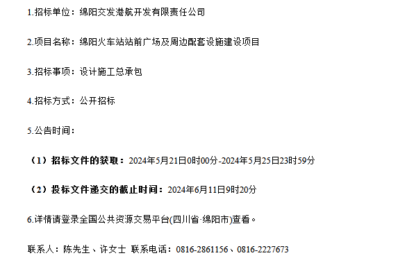綿陽火車站站前廣場及周邊配套設(shè)施建設(shè)項(xiàng)目(第二次)設(shè)計(jì)施工總承包標(biāo)段招標(biāo)公告