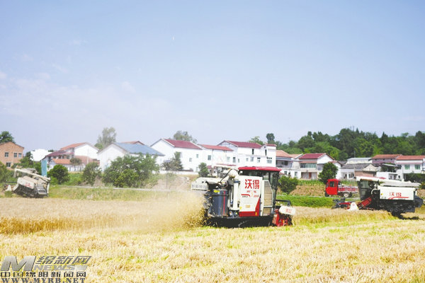 在梓潼縣文昌鎮(zhèn)潼江河谷優(yōu)質(zhì)糧油現(xiàn)代農(nóng)業(yè)園區(qū)金色麥田里,金燦燦的小麥,沉甸甸的麥穗壓彎了腰。10臺聯(lián)合收割機在金色的麥浪中來回穿梭,機器過后留下一排排整齊的麥茬,切割、剝殼、脫粒……在農(nóng)機駕駛員的操作下一氣呵成。同時秸稈就地粉碎還田,為后續(xù)栽插雜交水稻打好基礎。