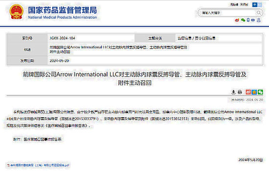 據(jù)國家藥監(jiān)局官網(wǎng)5月20日消息,箭牌國際公司Arrow International LLC主動(dòng)召回主動(dòng)脈內(nèi)球囊反搏導(dǎo)管、主動(dòng)脈內(nèi)球囊反搏導(dǎo)管及附件。(商品名:主動(dòng)脈內(nèi)球囊反搏導(dǎo)管及附件Intra-AorticBalloon(IAB)CatheterKit;主動(dòng)脈內(nèi)球囊反搏導(dǎo)管Intra-AorticBalloon(IAB) CatheterKit)。