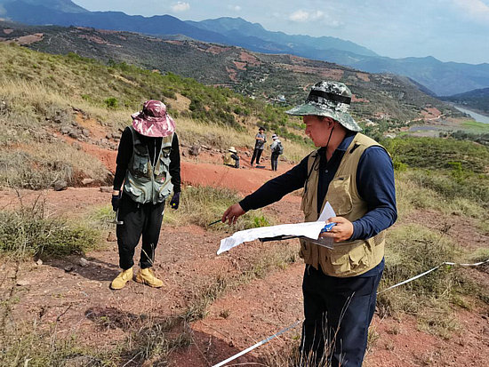 工作人員在現(xiàn)場測量恐龍足跡化石。(祿豐市融媒體中心供圖)