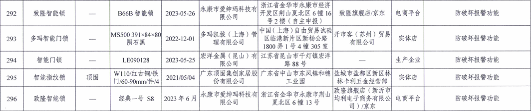 5批次不合格智能鎖產(chǎn)品具體為: