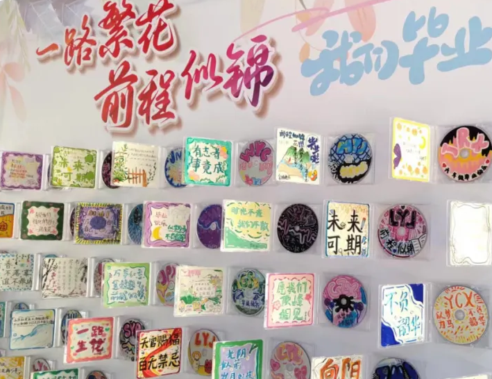 六年級(jí)的孩子們以“一路繁花,前程似錦”為主題,利用 CD光盤(pán)為材料,以桃花作封面,寓意孩子們?nèi)缡㈤_(kāi)的桃花,內(nèi)側(cè)書(shū)寫(xiě)畢業(yè)寄語(yǔ)和名字字母加上涂鴉繪畫(huà),一張張小小的CD,寄予對(duì)母校的祝愿。