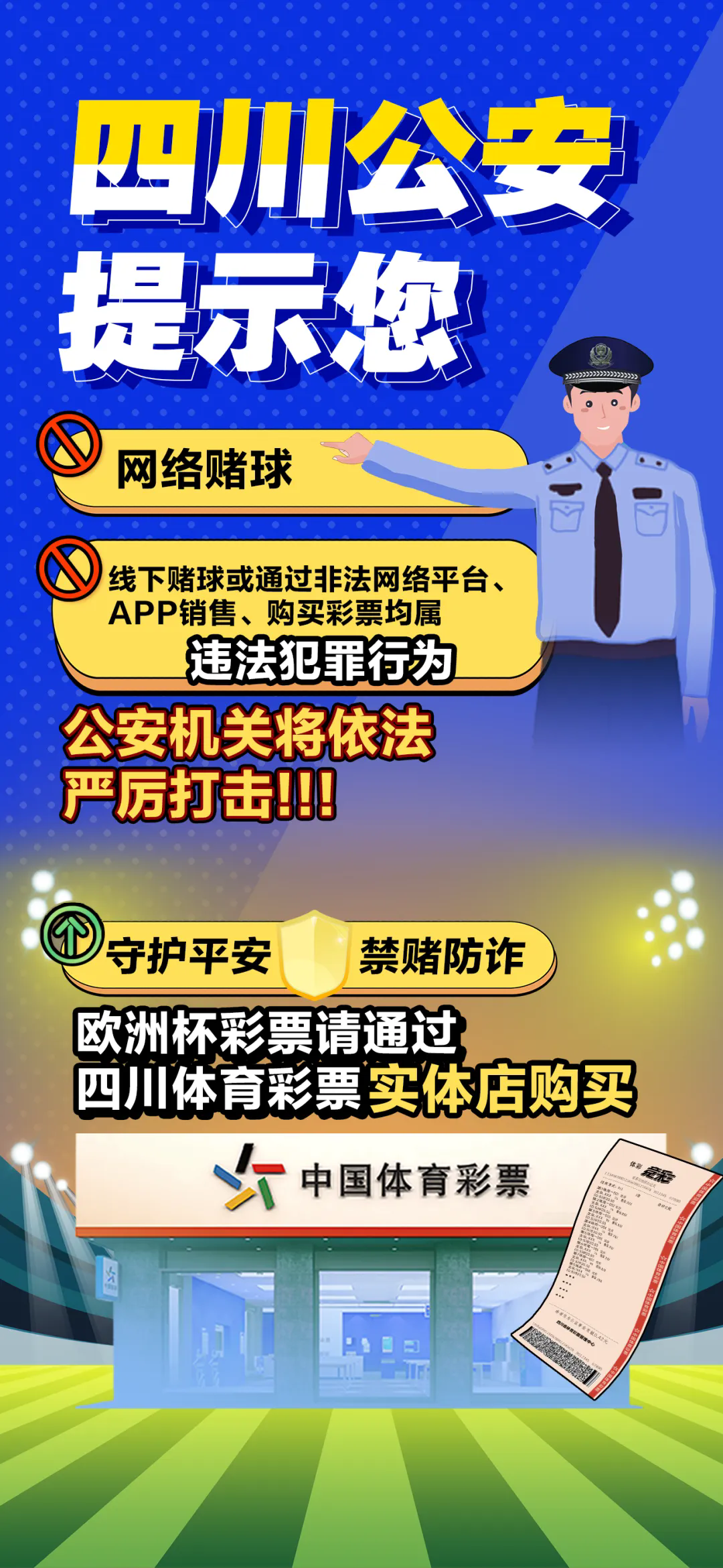 不法分子利用互聯(lián)網(wǎng)設(shè)立線上賭場,套取被害人身份信息,并引誘被害人充值下注。隨后騙子要么通過控制賠率獲取“差價”,要么直接收錢跑路,讓被害人無法獲得本金及所謂的收益。投資不投機(jī),看球莫賭球。目前國內(nèi)銷售的與足球、籃球賽事比賽結(jié)果有關(guān)的彩票,只有國家特許發(fā)行的“中國體育彩票”是合法彩票,廣大球迷消費(fèi)者應(yīng)自覺遠(yuǎn)離非法彩票,如需購買歐洲杯彩票,請通過四川體育彩票實(shí)體店購買。