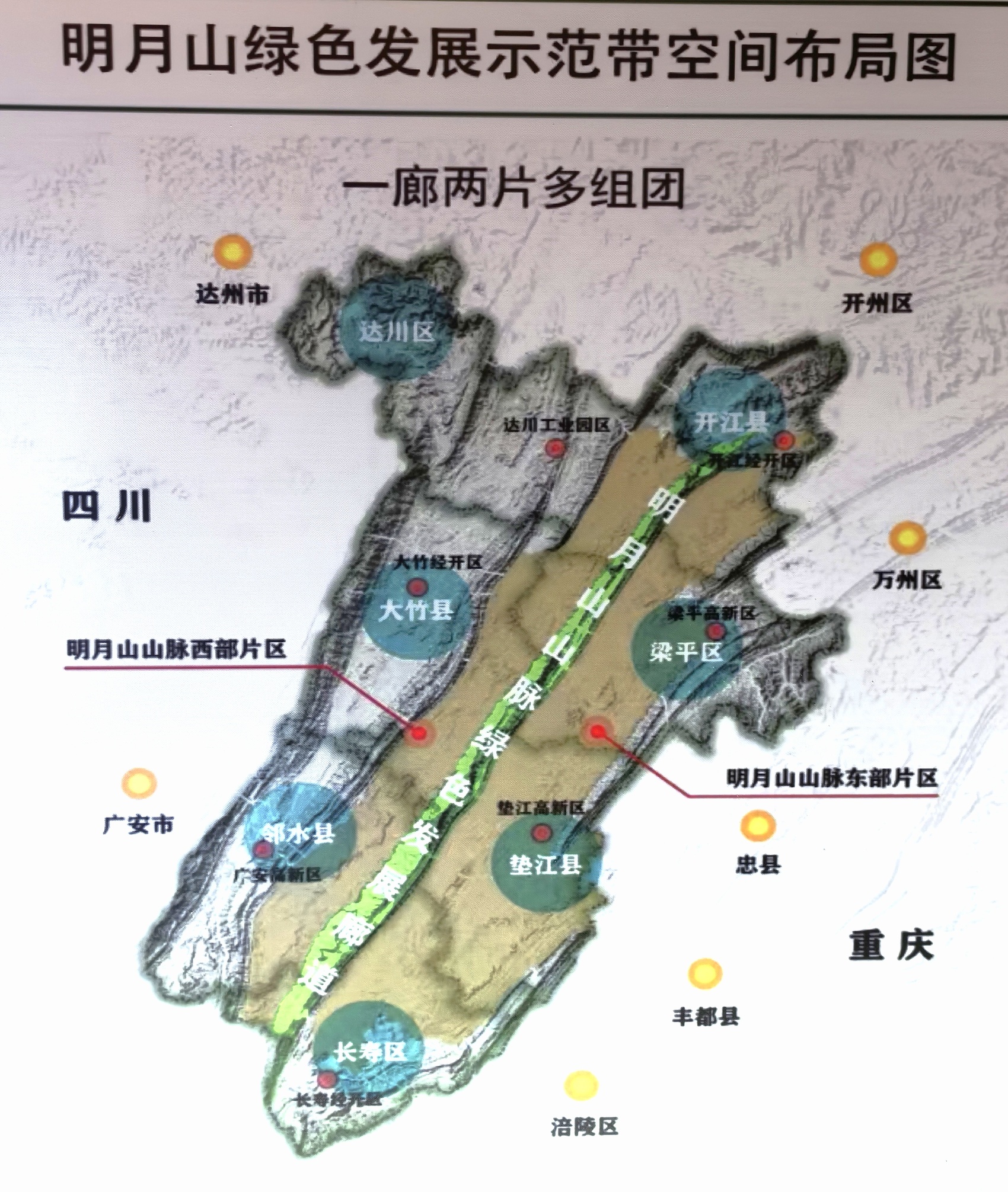 明月山是川東平行嶺谷區(qū)的第三條山脈,東側(cè)、西側(cè)分布著重慶市梁平區(qū)、長壽區(qū)、墊江縣及四川省達(dá)州市達(dá)川區(qū)、開江縣、大竹縣和廣安市鄰水縣共7個縣(區(qū)),過去由于山巒阻隔,相關(guān)區(qū)縣交流交往并不充分。近年來,作為10個川渝毗鄰地區(qū)合作共建區(qū)域發(fā)展功能平臺之一,共建明月山綠色發(fā)展示范帶聚焦綠色一體化制度創(chuàng)新試驗田、生態(tài)經(jīng)濟(jì)創(chuàng)新發(fā)展試驗區(qū)、人與自然和諧發(fā)展示范區(qū)三大定位,7個縣(區(qū))簽署各方面協(xié)議110余份,部署落實119項年度重點任務(wù),協(xié)同發(fā)展效應(yīng)加速顯現(xiàn)。