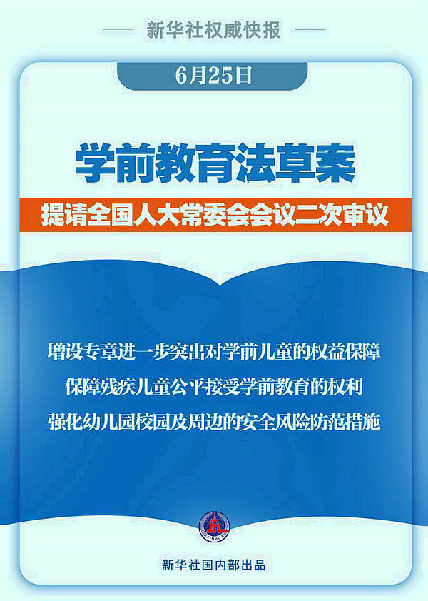 學(xué)前教育法草案6月25日提請(qǐng)全國(guó)人大常委會(huì)會(huì)議二次審議。