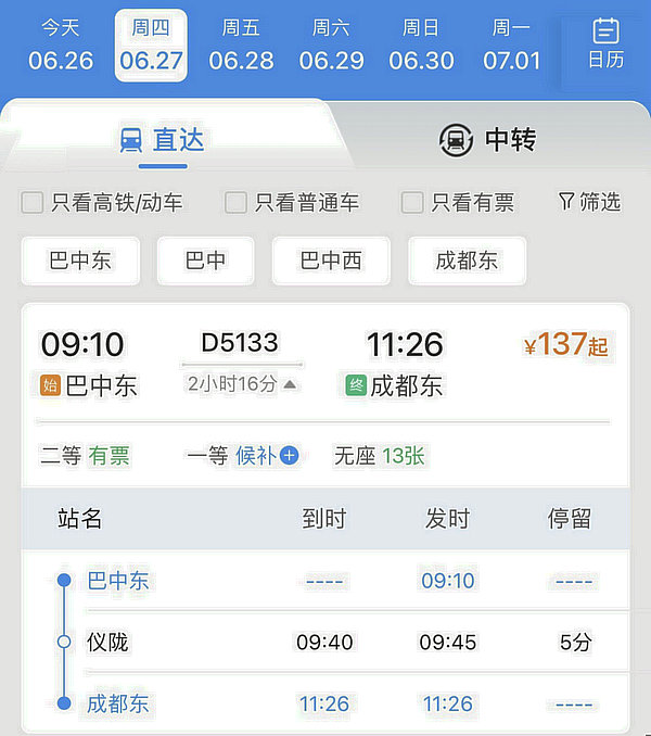 首發(fā)動車將于6月27日9:10分從巴中開出,只經(jīng)停儀隴一站,11:26分抵達(dá)成都。