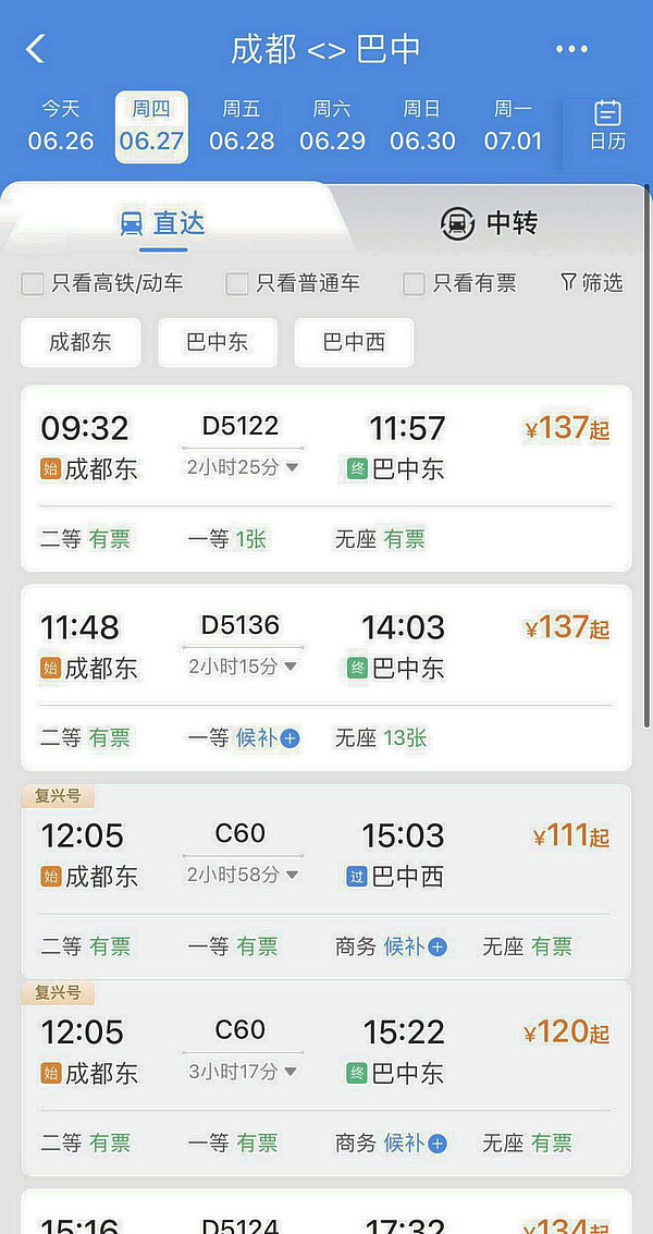 從12306網(wǎng)站上的票價來看,經(jīng)巴南高鐵的車次不同、價格不等,比如巴中東至成都的二等座,最低113元,最高137元。