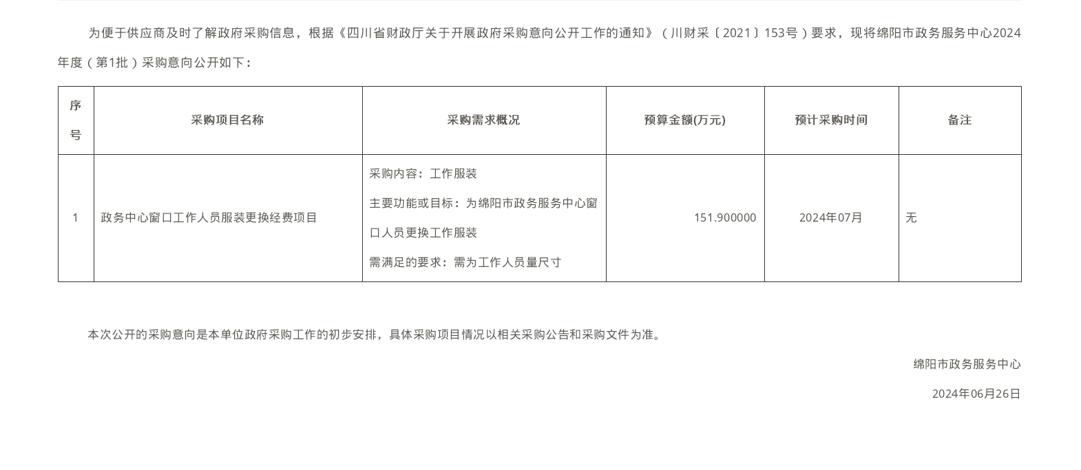 綿陽(yáng)市政務(wù)服務(wù)中心2024年度政府采購(gòu)意向公告(第1批)