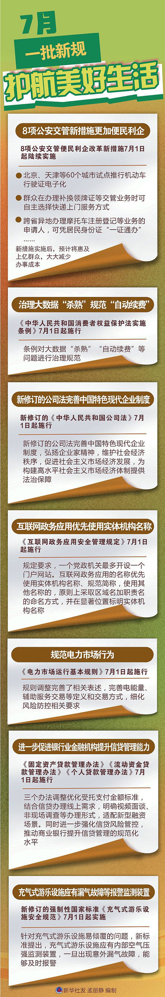 8項公安交管新措施更加便民利企,大數(shù)據(jù)“殺熟”“自動續(xù)費”等問題進一步治理規(guī)范,新修訂的公司法完善中國特色現(xiàn)代企業(yè)制度……7月,一批新規(guī)開始施行,更完善的法治,護航美好生活。