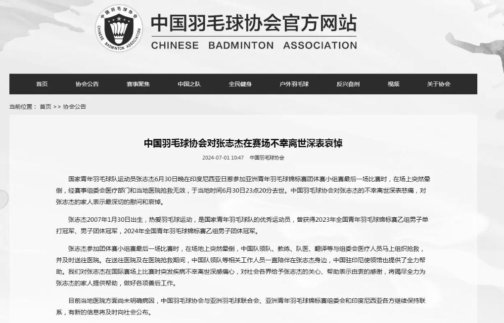 “我們對(duì)張志杰在國(guó)際賽場(chǎng)上比賽時(shí)突發(fā)疾病不幸離世深感痛心,對(duì)社會(huì)各界給予張志杰的關(guān)心、幫助表示由衷的感謝,將竭盡全力為張志杰的家人提供幫助,做好各項(xiàng)善后工作。”中國(guó)羽協(xié)在公告中寫(xiě)道。