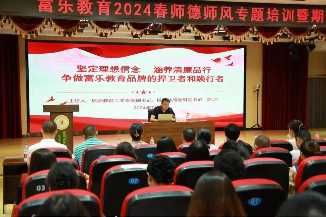 本次專題培訓(xùn)特別邀請(qǐng)了區(qū)委教育工委專職副書記、區(qū)教體局黨組副書記陳潔作主題講座。陳潔作了題為《堅(jiān)定理想信念 涵養(yǎng)清廉品行——爭做富樂教育品牌的捍衛(wèi)者和踐行者》的專題講座。陳潔的講座從堅(jiān)定不移的推進(jìn)新時(shí)代黨的政治建設(shè)、堅(jiān)定不移的強(qiáng)化新時(shí)代黨的紀(jì)律建設(shè)和準(zhǔn)確認(rèn)識(shí)和把握新形勢下社會(huì)的發(fā)展變化三個(gè)方面,深入剖析了新形勢下人人都應(yīng)做到三要:要有獨(dú)立的思考、要有家國情懷和要有感人之心。他結(jié)合當(dāng)前教育新形式,深入剖析了師德師風(fēng)建設(shè)的內(nèi)涵、重要性和實(shí)踐路徑。同時(shí),他指出作為教育工作的主體,教師必須要堅(jiān)守教育初心、清廉從教,不斷提升專業(yè)素養(yǎng)和道德水平,做學(xué)生健康成長的引路人。