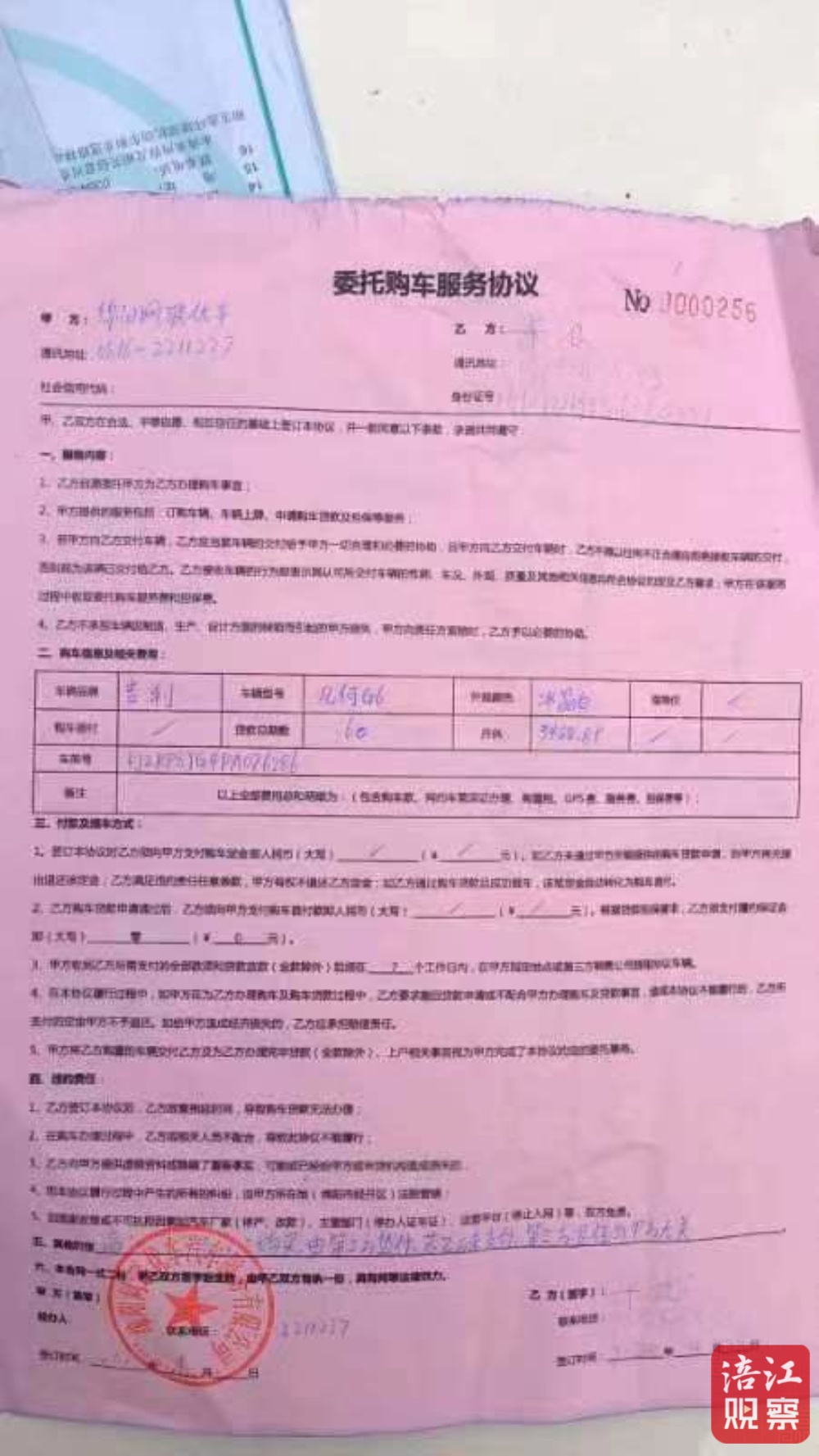 4月27日,梁波和該公司簽訂了《委托購車服務(wù)協(xié)議》,其中“購車信息和相關(guān)費用”一欄,只有“貸款總期數(shù)60”和“月供3488.89元”,指導(dǎo)價和購車首付都劃了“/”。