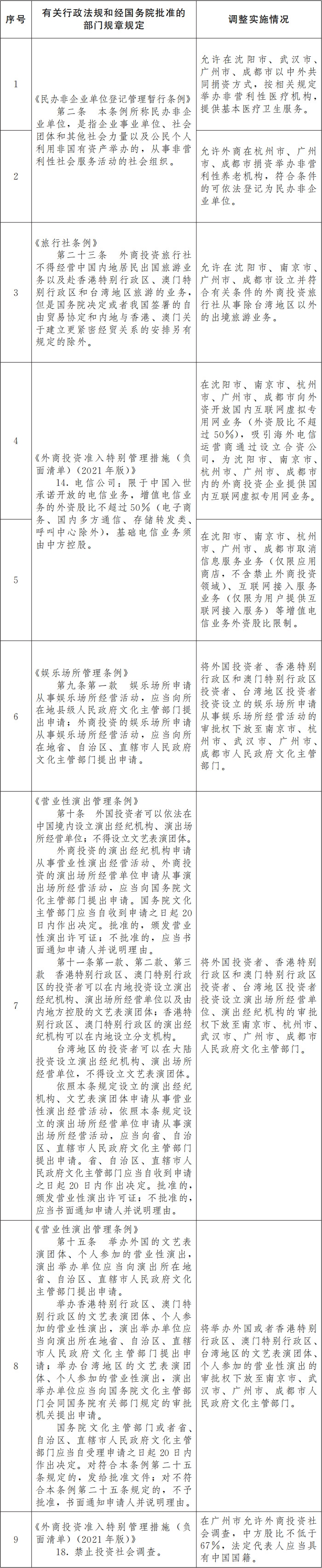 一、按照《國務院關于同意在沈陽等6個城市開展服務業(yè)擴大開放綜合試點的批復》(國函〔2022〕135號),同意自即日起,在沈陽市、南京市、杭州市、武漢市、廣州市、成都市等6個服務業(yè)擴大開放綜合試點城市暫時調整實施《民辦非企業(yè)單位登記管理暫行條例》、《旅行社條例》、《娛樂場所管理條例》、《營業(yè)性演出管理條例》、《外商投資準入特別管理措施(負面清單)(2021年版)》的有關規(guī)定(目錄附后)。