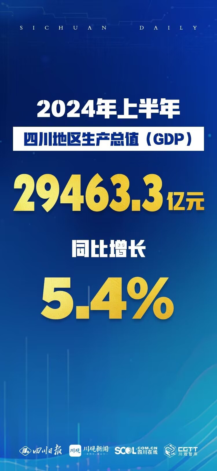 7月17日,省統(tǒng)計局發(fā)布數(shù)據(jù),根據(jù)地區(qū)生產(chǎn)總值統(tǒng)一核算結(jié)果,上半年四川地區(qū)生產(chǎn)總值為29463.3億元,按不變價格計算,同比增長5.4%。其中,第一產(chǎn)業(yè)增加值為2142.8億元,增長2.8%;第二產(chǎn)業(yè)增加值為10546.7億元,增長5.4%;第三產(chǎn)業(yè)增加值為16773.8億元,增長5.8%。