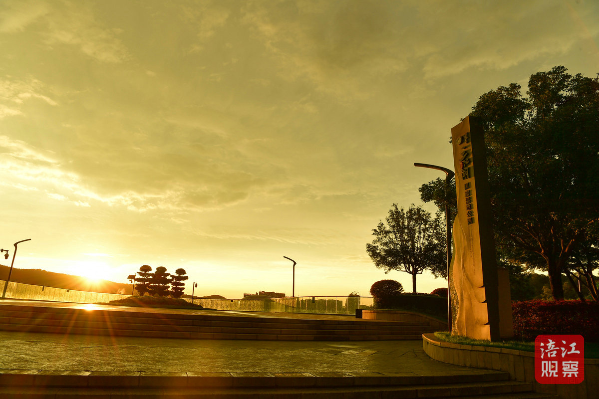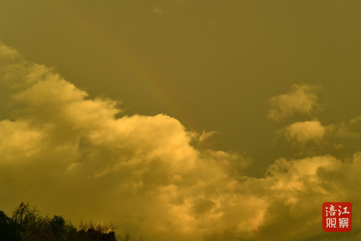 7月22日早上6時許,初升的太陽從東方冉冉升起,一時間霞光萬丈,把綿陽城區(qū)三江湖兩岸的樓宇、樹木、健身步道染上了一層金黃色,與短暫出現(xiàn)的彩虹相映成景,美不勝收。